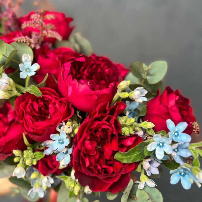 Роза пионовидная – 9 шт.Астильба – 4 шт.Оксипеталум – 11 шт.Эвкалипт – 7 шт.