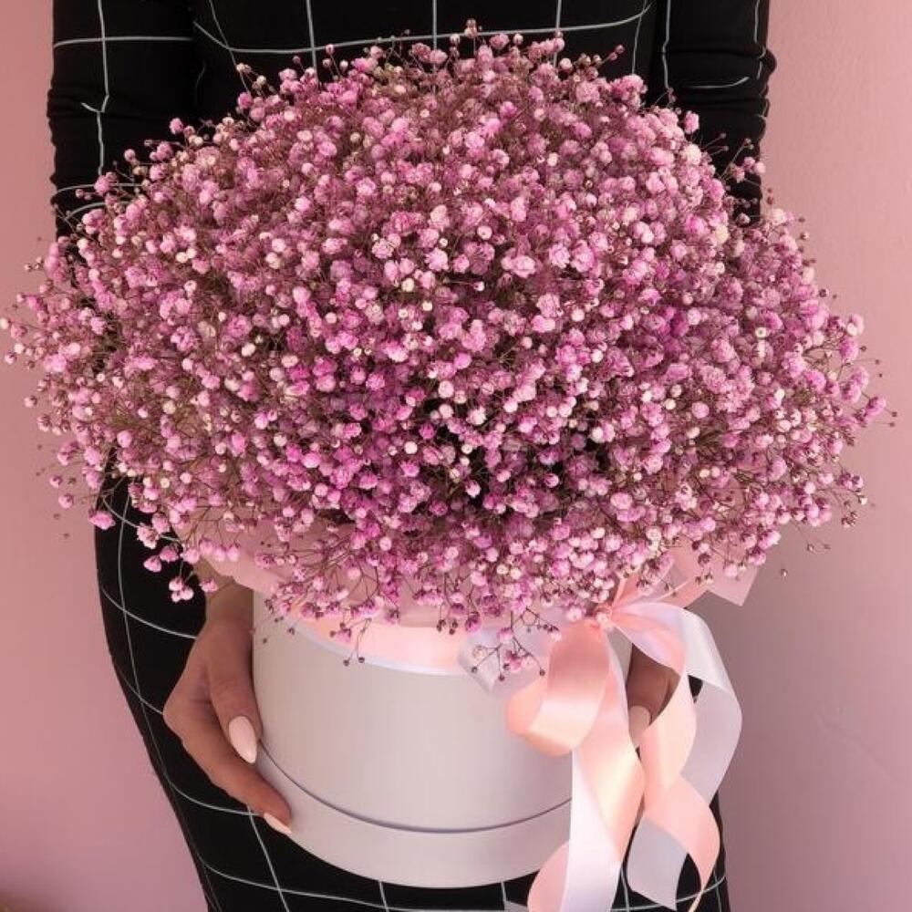Лента атласная – 1 шт.шляпная коробка в ассортименте – 1 шт.оазис флорстический – 1 шт.гипсофила цветная крашеная – 15 шт.